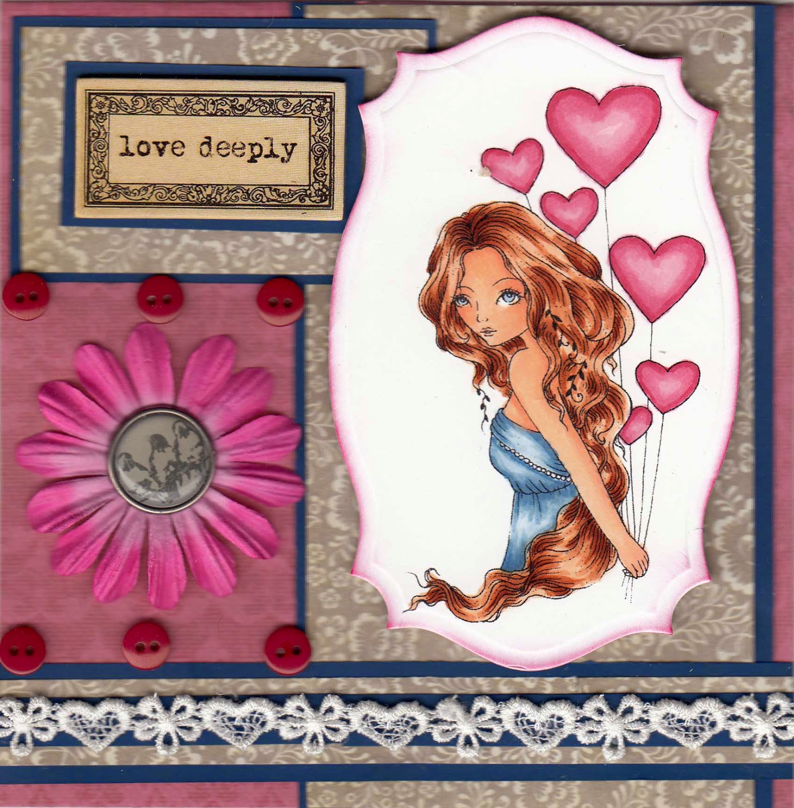 The current contest over at the East Wind Challenge is to use Fiber of any kind, so the ribbon, lace and hmmm, maybe even the banner might count....well, definitely the first two, the last one has a fiber in it! Hope you all are having a happy April.