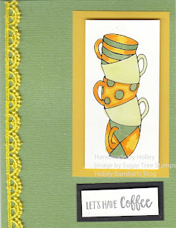 Thought I would end the first week of school with a little coffee themed card.  Don't we all need that sometimes (and often?)  I know I enjoyed it often this summer, that's for sure.  I totally love this stamp from My Cute Lobster designs and I added some great turkish lace that I got back in 2020.